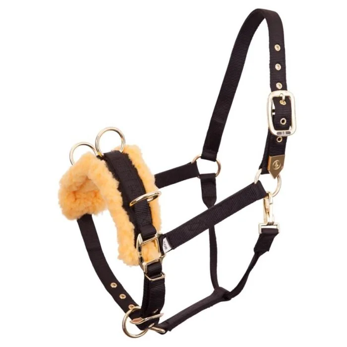 Sterke, zachte nylon kaptoom met zware messing fournituren en een brede, met fleece gevoerde neusriem.