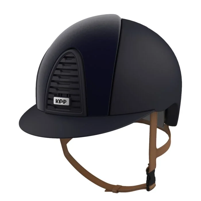 Deze zwarte rijhelm van Kep Italia heeft een beige kinband.