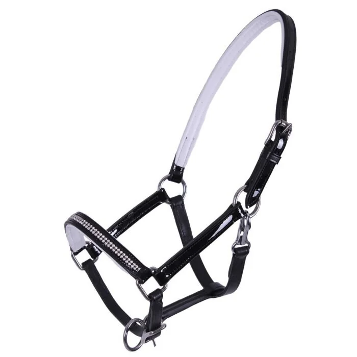 QHP Leren Veulenhalster Mimas Chic lakleren veulenhalster met twee rijen strass steentjes in de neusriem. Voorzien van witte padding onder het kopstuk en de neusriem. Dubbel verstelbaar. Kleur: Zwart/Wit Maten: Pony veulen en Paard veulen.